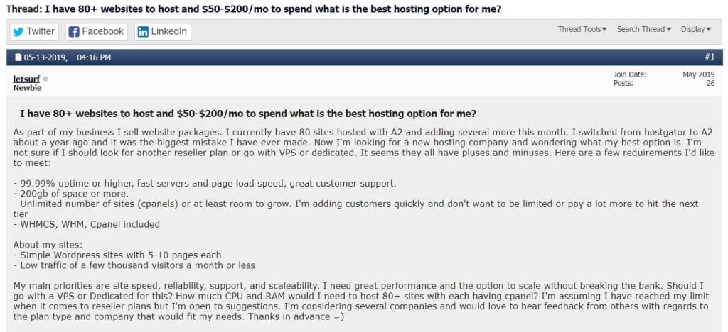 Sur ce forum, des personnes à la recherche d’une solution d’hébergement demandent des recommandations :