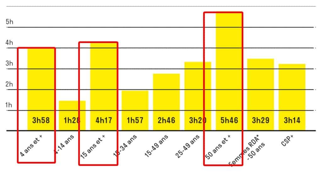 La durée moyenne du temps passé à l’écoute de la TV. Elle peut être calculée pour un programme, une chaîne, ou pour toutes les chaînes confondues.