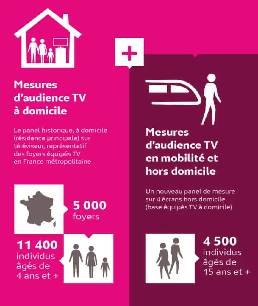 - Mesure d’audience TV à domicile : 5000 foyers représentants plus de 11 000 individus âgés de 4 ans et plus.