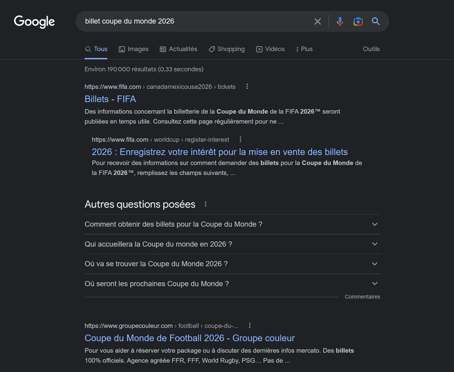 Dans le premier cas, Google affiche des informations générales sur la coupe du monde, et dans le second, des informations spécifiques à la réservation de billets :