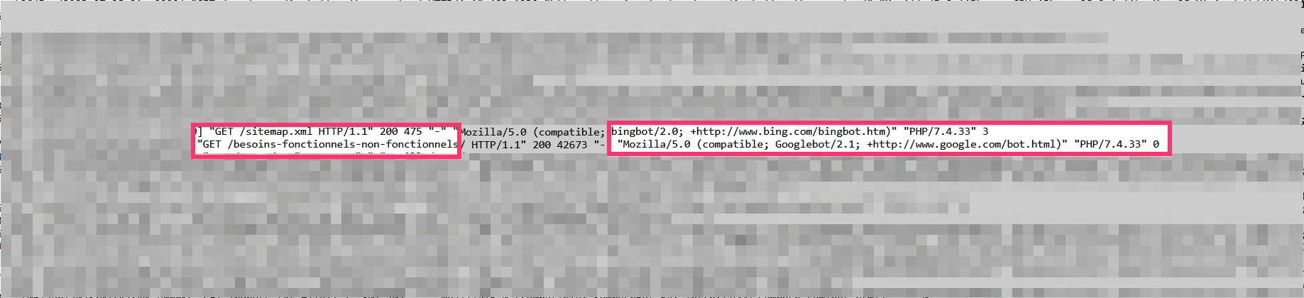 Dans les logs ci-dessous, je vois par exemple que Bingbot a visité le fichier sitemap.xml de savoir.plus et que Googlebot une page spécifique du site :