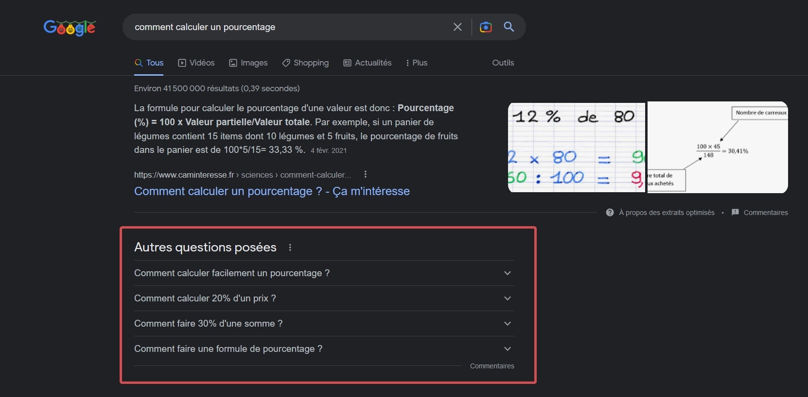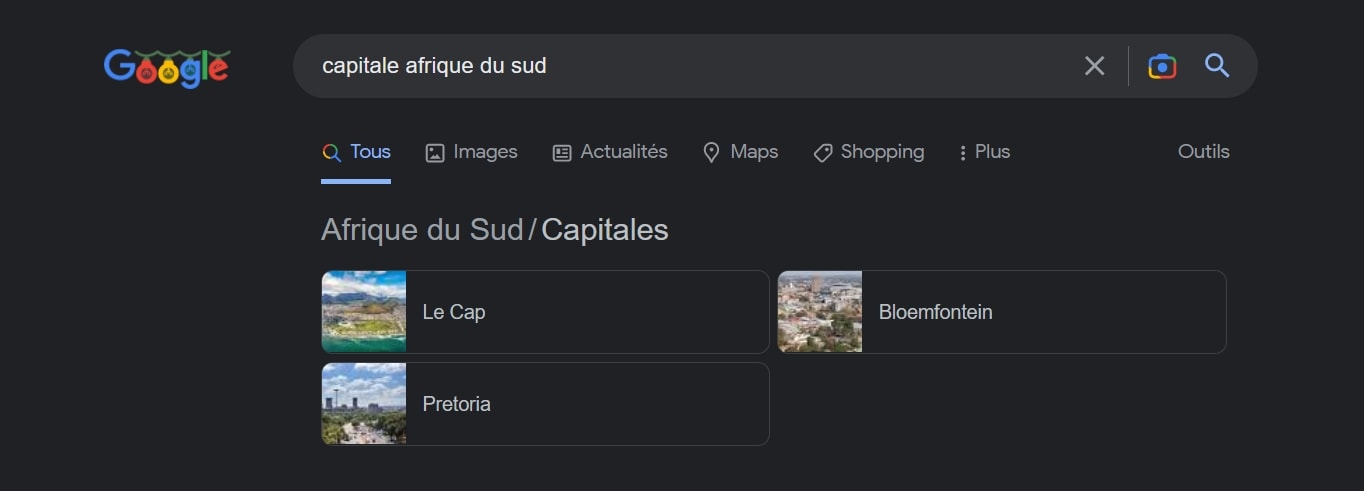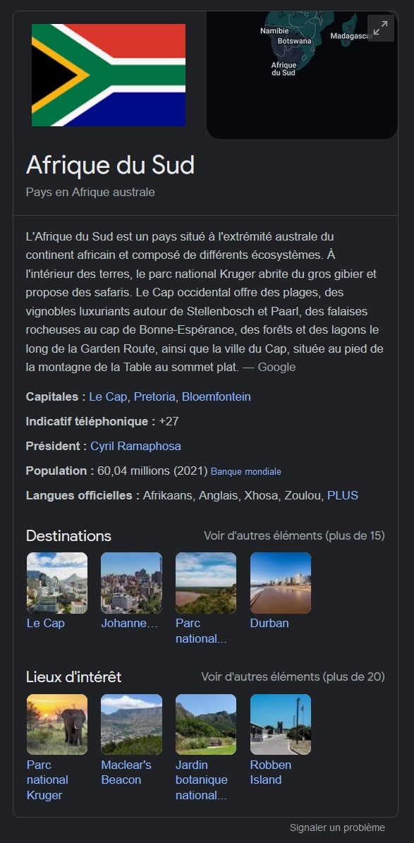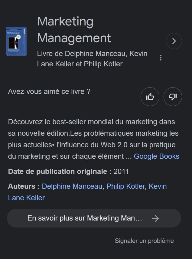 Rendu possible là encore grâce au knowledge graph de Google, il affiche en haut des résultats ou sur le côté droit des SERP des informations structurées et complémentaires par rapport à la requête initiale.